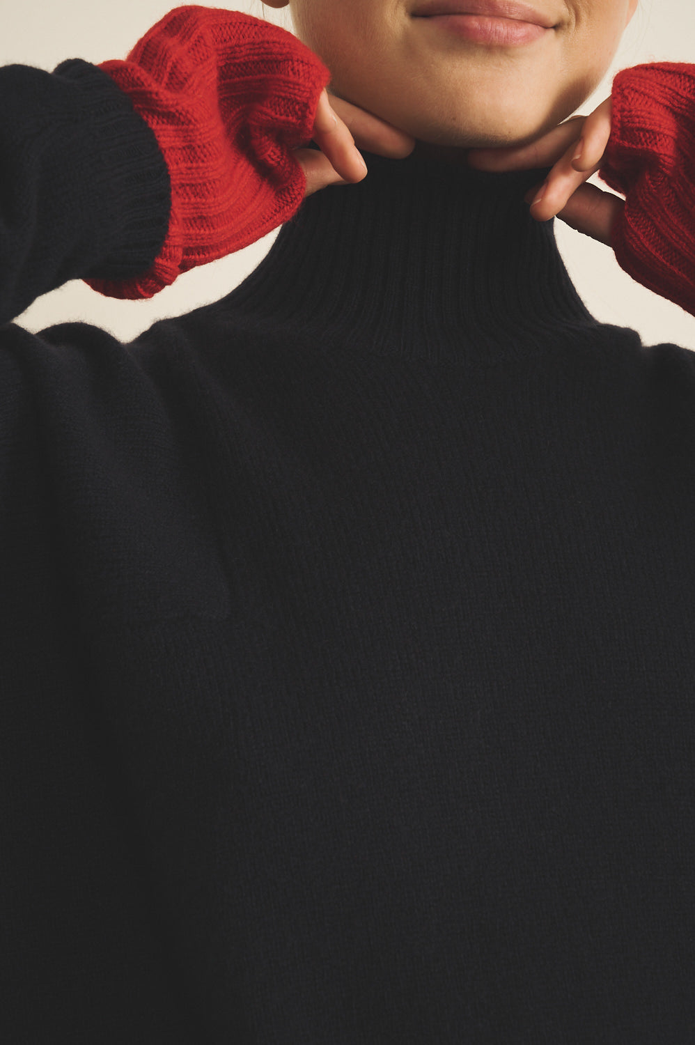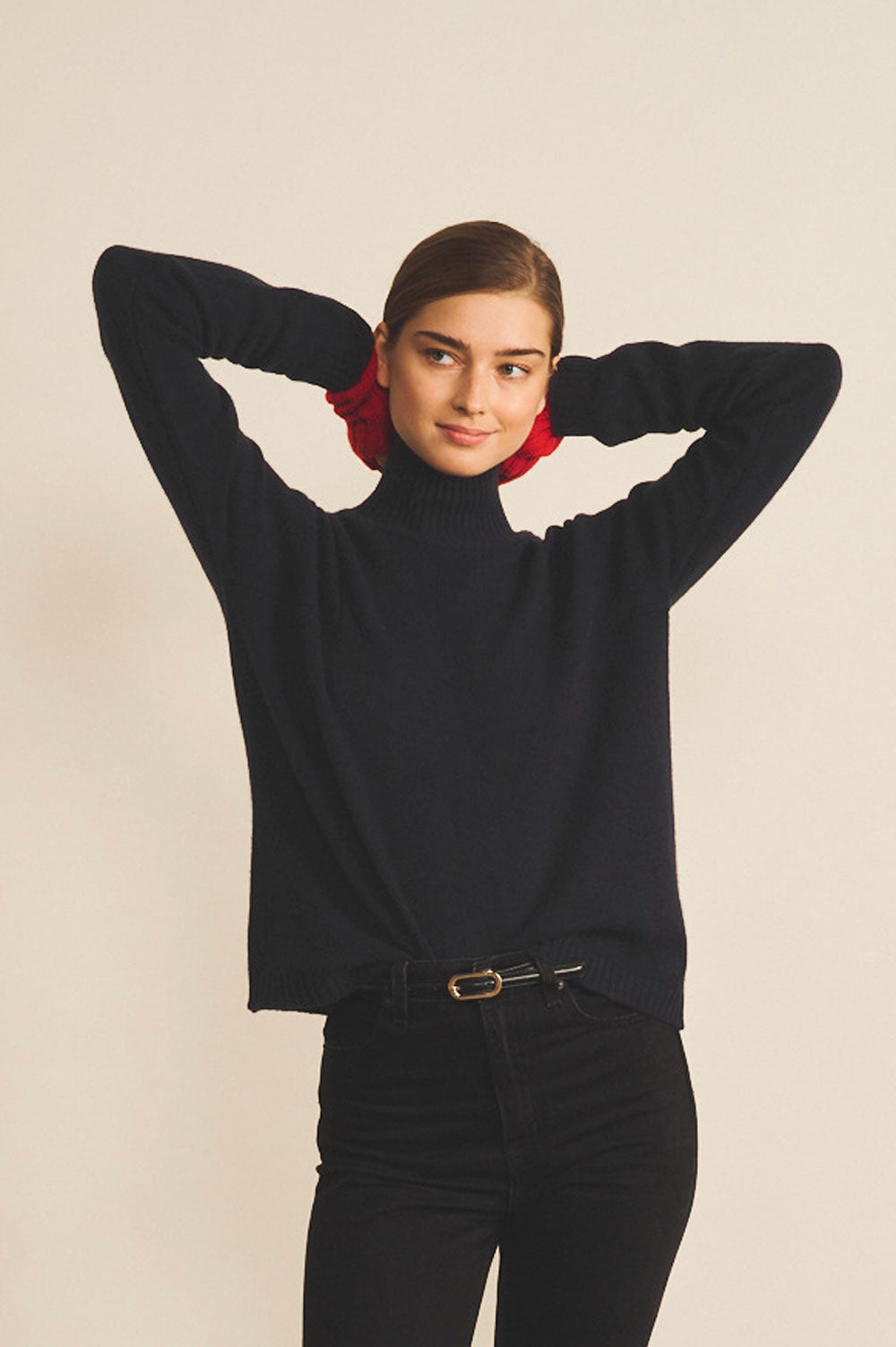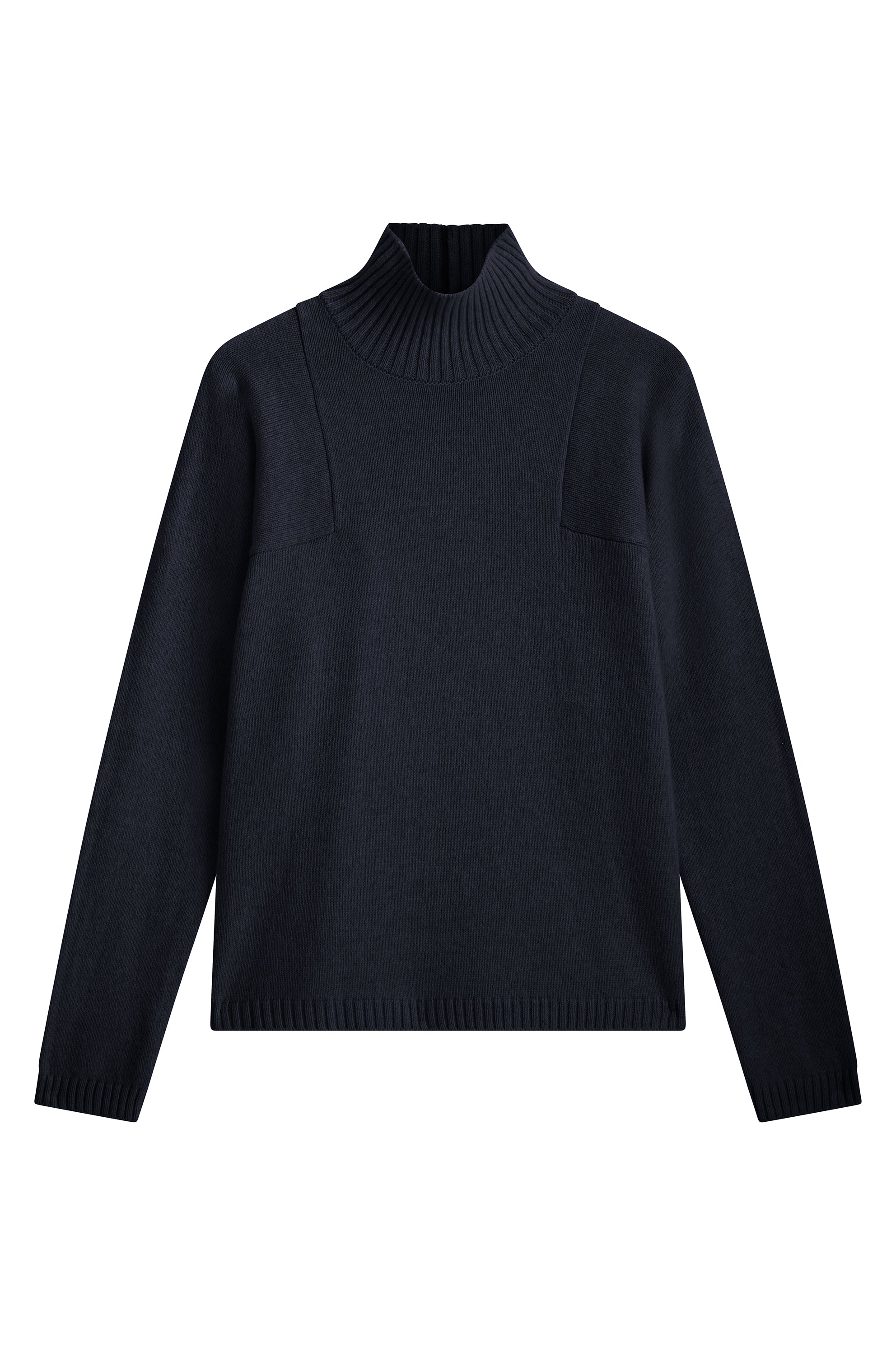 dark navy cashmere turtle neck with deep modified drop sleeves.